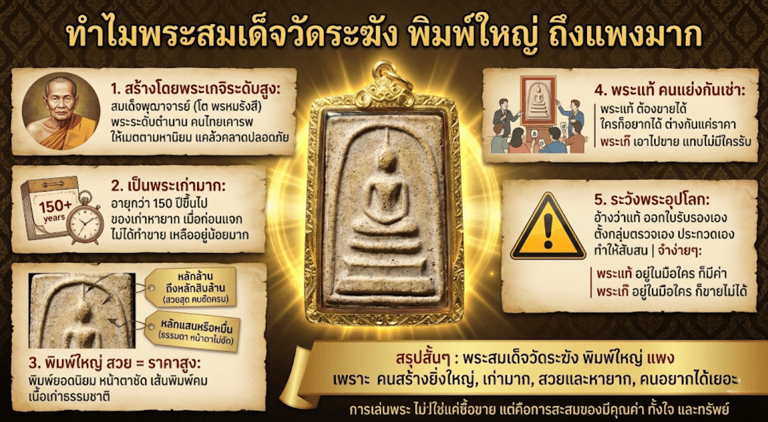 สรุปสั้นๆ พระสมเด็จวัดระฆัง พิมพ์ใหญ่ แพงเพราะ คนสร้างยิ่งใหญ่ เก่ามาก สวยและหายาก คนอยากได้เยอะการเล่นพระไม่ใช่แค่ซื้อขายแต่คือการสะสมของมีคุณค่าทั้งใจ และทรัพย์